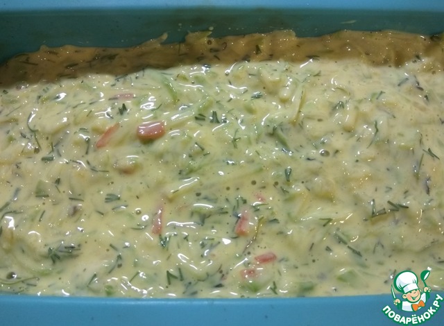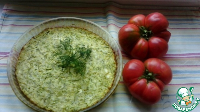 Вкусная диетическая запеканка из кабачка и творога с ароматом маринованного огурчика.
