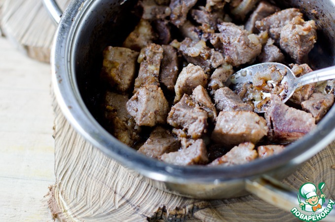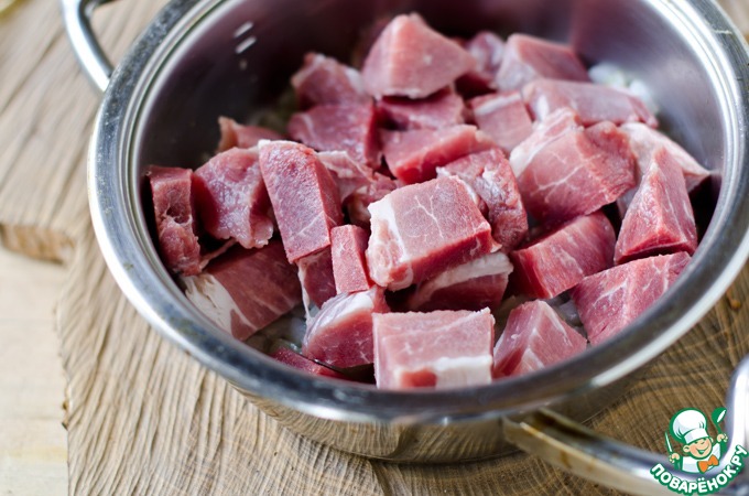 Мясо, у меня лопатка, нарезать кубиками и добавить к луку.