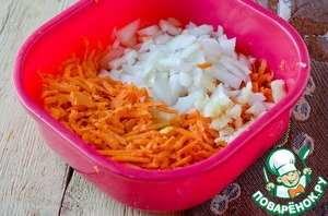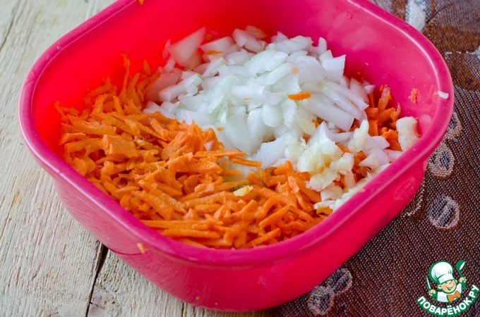 Морковь, чеснок и лук очистить. Морковь натереть на терке, а лук и чеснок мелко порубить.