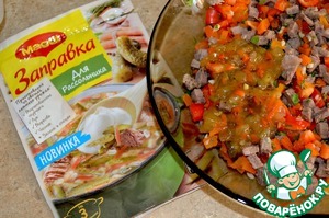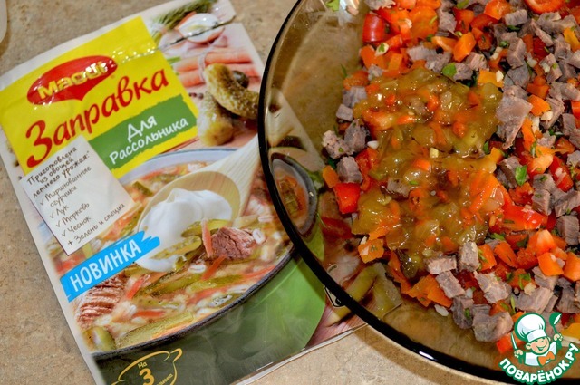 • Добавляем заправку Магги для рассольника, перчим и перемешиваем.