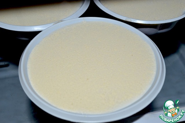 • Бульон процеживаем, добавляем в него желатин и помешивая нагреваем до 60 С. Желатин должен полностью раствориться. Даем остыть. Наливаем 3/4 стакана бульона и оставляем.