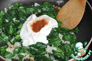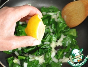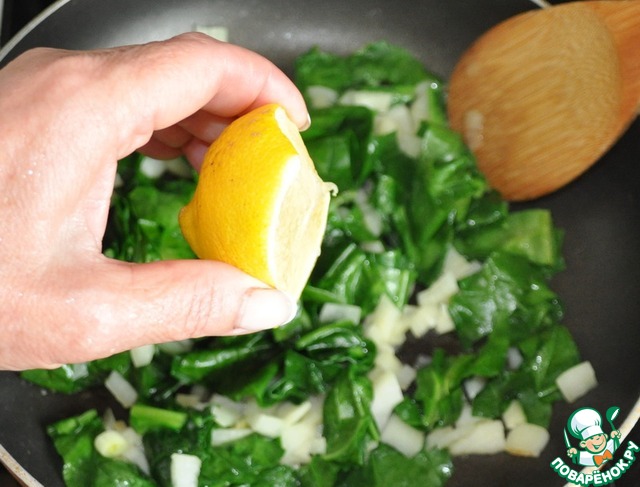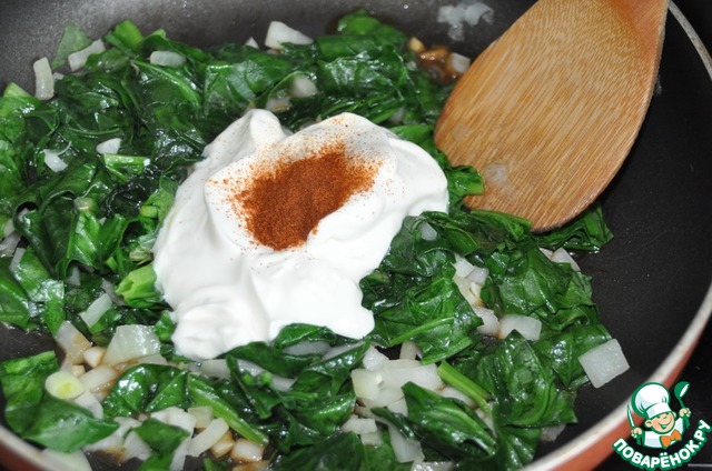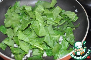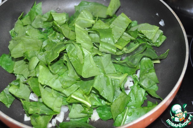 Шпинат хорошо промываем, режем и кладём на сковороду, готовим 2 минуты на среднем огне.