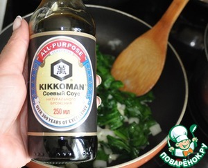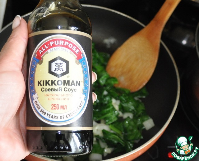 Наливаем соевый соус ТМ Kikkoman, перемешиваем, убираем с огня, даём немного остыть.