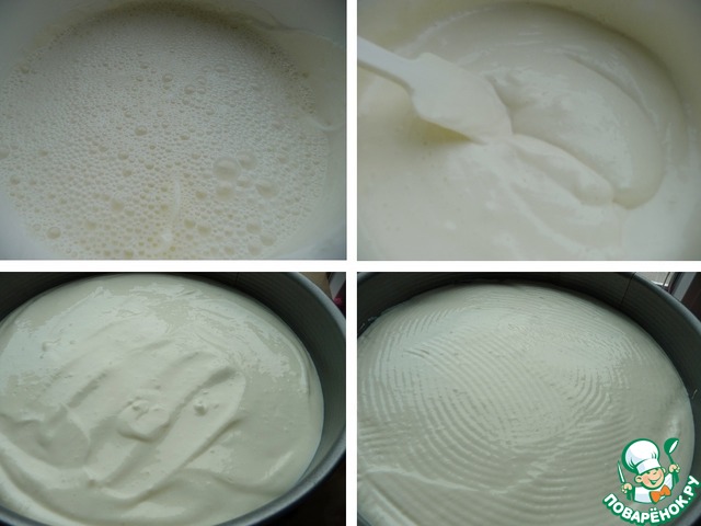 Соединить крем с желированной массой, хорошо взбить, подождать пару минут, чтобы крем схватился. Выложить крем на печенье, форму слегка ударить по столу, выровнять поверхность и поставить в холодильник минимум на 3 часа. Я прошлась шпателем, можно нанести рисунок вилкой. Может, кому-то пригодится, стенки формы я смазала слегка растительным маслом без запаха.
