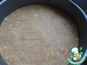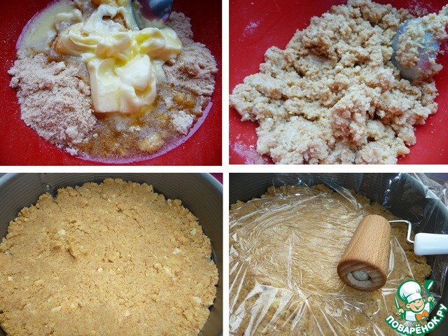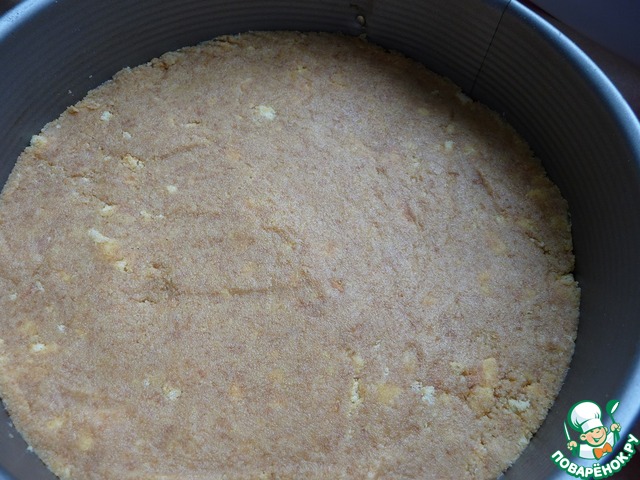 Тщательно перемешать. Выложить в разъемную форму 26 см, застеленную пекарской бумагой. Выровнять поверхность ложкой, вдавливая ее в тесто. Я использовала валик для теста через пищевую пленку. -