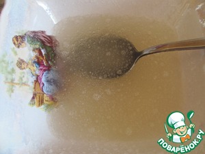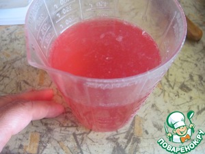 В компот влить распущенный желатин и добавить немного красного красителя для оттенка. Если у вас вода, то она должна быть кипяченой. Растворите в ней сахар, добавьте лимонный сок. Доведите до вашего вкуса. Влейте желатин и добавьте краситель.