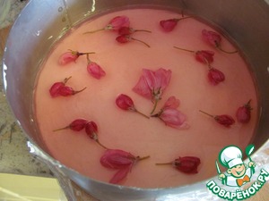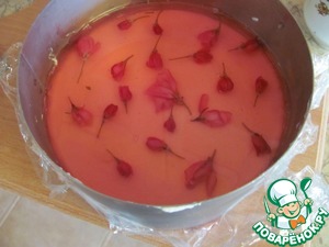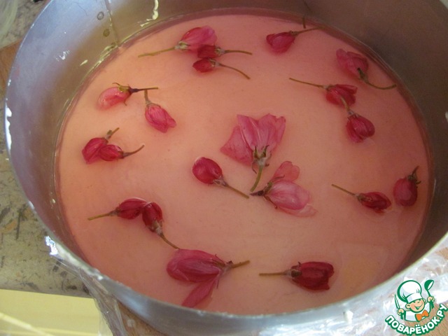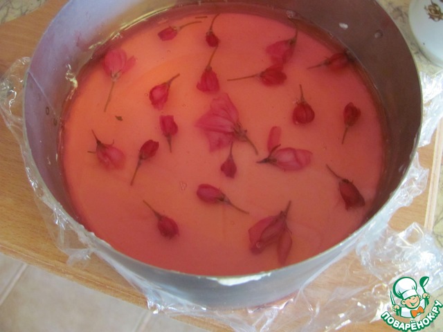 Вылейте половину желе, разложите цветы. Поставьте с морозильную камеру на 20 минут. Когда желе схватится, достаем и доливаем оставшееся желе. Ставим в холодильник до полного застывания.
