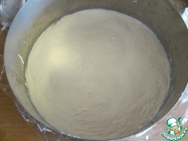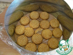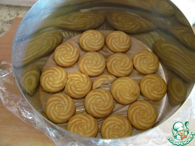 Кольцо затянуть пленкой и поставить на ровную дощечку. На бока поставить кондитерскую ленту (я забыла это сделать, а зря). Выложите на дно печенье. Слой не обязательно должен быть монолитным. -