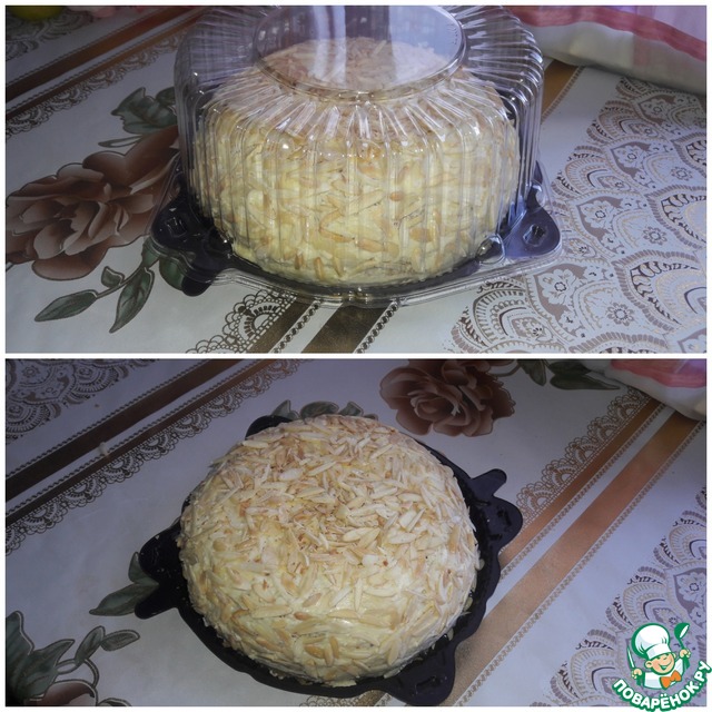 Я сверху покрыла миндалем ,мне кажется вкус только выиграл ,т к в бисквите особо не ощущается миндаль ,и по вкусу получается крем с кокосом и посыпка миндальная вообще супер - они созданы друг для друга) ))))