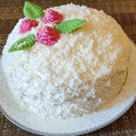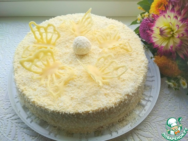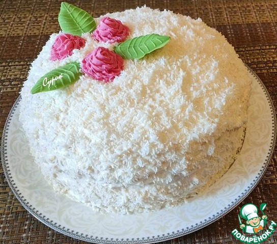Кремом обмазать и бока торта. Обсыпать торт кокосовой стружкой. Поставить в холодильник хотя бы на полчаса. Все готово!