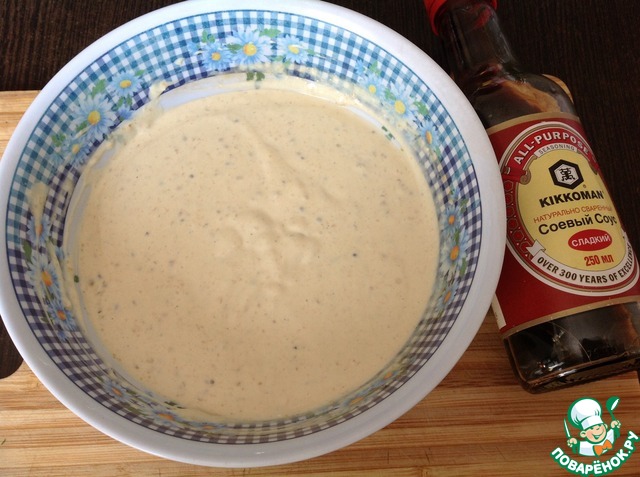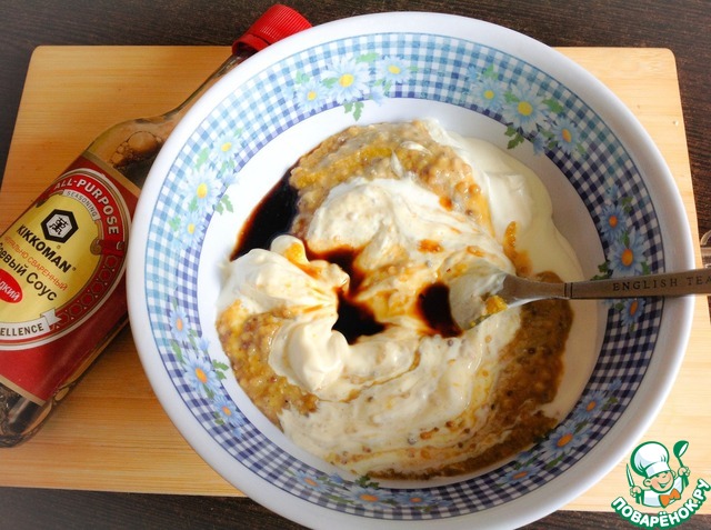 В миску добавить горчицу, сметану, майонез, соевый соус (я использовала натурально сваренный соевый соус ТМ Киккоман).
