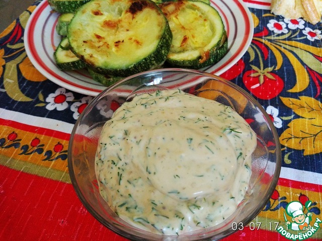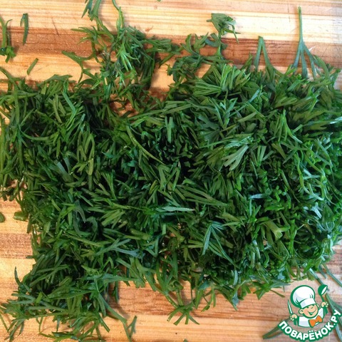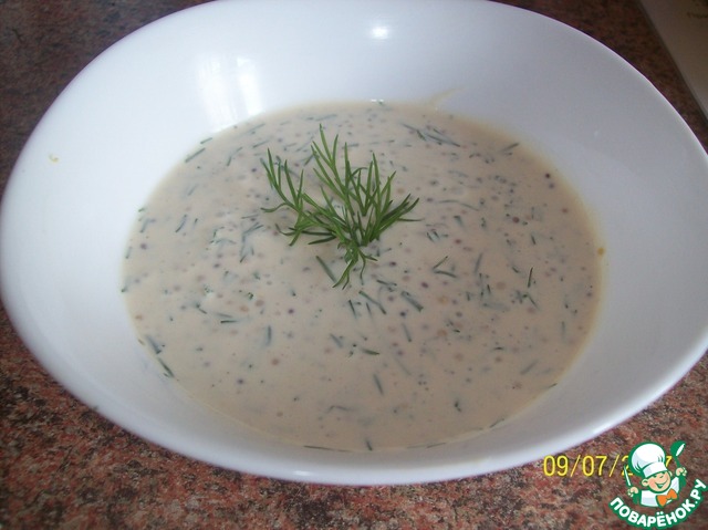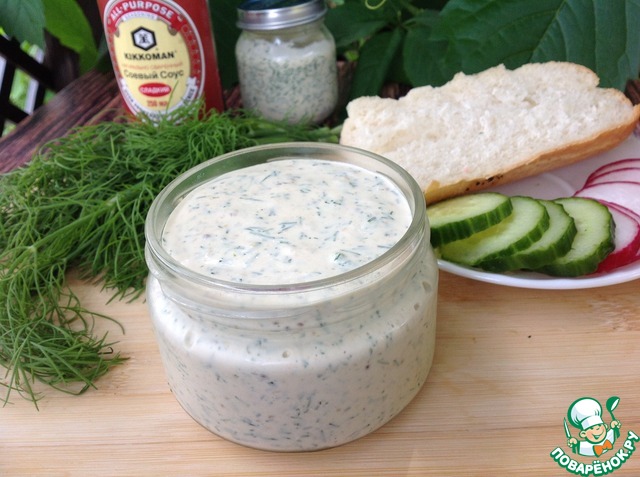 Укроп сполоснуть, обсушить и мелко нарезать. Добавить в соус и перемешать.