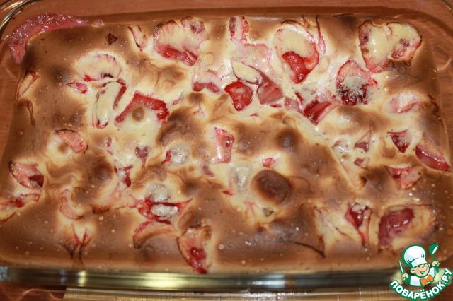 Остальную массу кладем на клубнику в форме. Можно сделать горячий вариант в порционных формах, чтобы было удобнее есть и не резать, ведь десерт очень нежный.