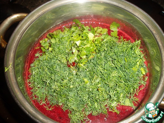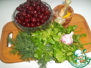 • Зелень режем мелко. Специи соль и сахар смешиваем в отдельной посудине. По истечении времени добавляем все это к вишне…