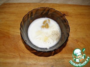 Соединить все ингредиенты для заправки (консистенция по своему вкусу), добавить специи, перемешать. |