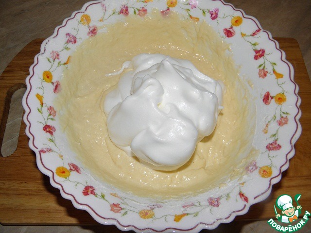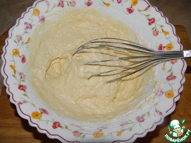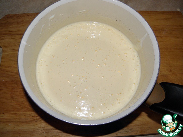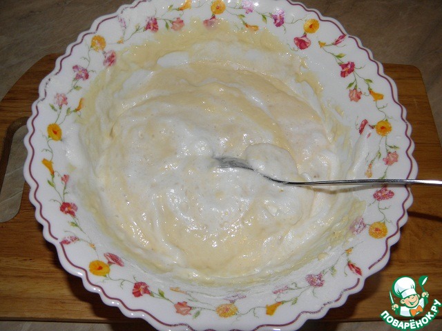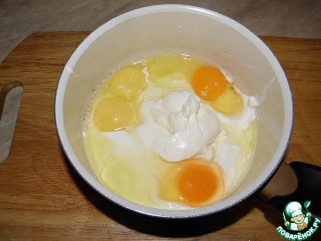 К сметане добавить два отделенных желтка и оставшиеся два целых яйца