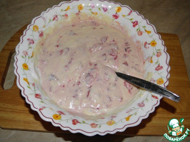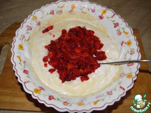 По поводу ягод я уже писала, лишний сок сливаем, а вот как раз крахмал и не дает превращаться тесту из за ягод в кашу