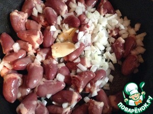 • Очищаем лук и режем его некрупно, разогреваем сковородку, немного добавляем сливочного масла. Обжариваем сердечки и лук вместе