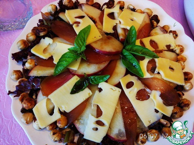Листья салата порвать на крупные куски, перемешать с остальной зеленью и заправкой. Персик нарезать дольками и разложить по краю тарелки.