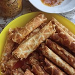 Сворачиваем в трубочки сразу, как достали, я добавляю сгущённое варёное молоко по чайной ложке, потом быстро заворачиваю, можно сделать рожок, а потом положить туда мороженое