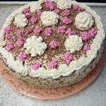 Собираем торт. Выкладываем сначала розовый корж и промазываем кремом. Накрываем вторым коржом, промазываем. Оставшийся крем наносим на бока, выравниваем их. Украшаем по своему желанию. Я лично натерла темный шоколад на крупной терке и посыпала ей верхушку тортика. А белый шоколад растопила на водяной бане и сделала бабочек. Также добавила в оставшийся крем розовый краситель. Убираем в холодильник на 3 часа.