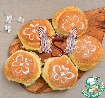 При желании можно украсить поверхность булочек используя различные трафареты. Для этого наложить трафарет на поверхность теста и через маленькое ситечко подпылить поверхность мукой.