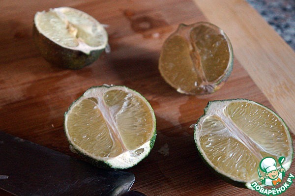 Сахар или мед предварительно растворить в небольшом количестве воды, можно подогреть ее, но потом, когда сахар растворится, обязательно охладить. Лимон и лайм тщательно помыть, срезать место, где плод крепится к ветке. Разрезать на небольшие дольки, стараясь не выдавливать при этом сок. Удалить косточки.