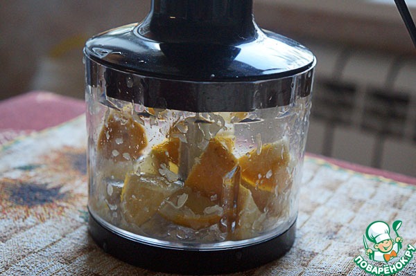 Разбить блендером, сложить вместе с выделившимся соком в емкость (у меня – трехлитровая банка).