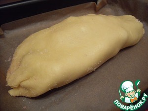 Аккуратно сверните рулет и переложите на противень, застеленный бумагой для выпечки.