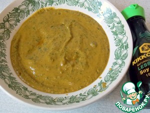 Добавить мелко тертый сыр, соевый соус ТМ "Kikkoman". Все хорошенько перемешать или пробить блендером и подавать. Если нужно то посолите по Вашему вкусу, лично нам этого не нужно.