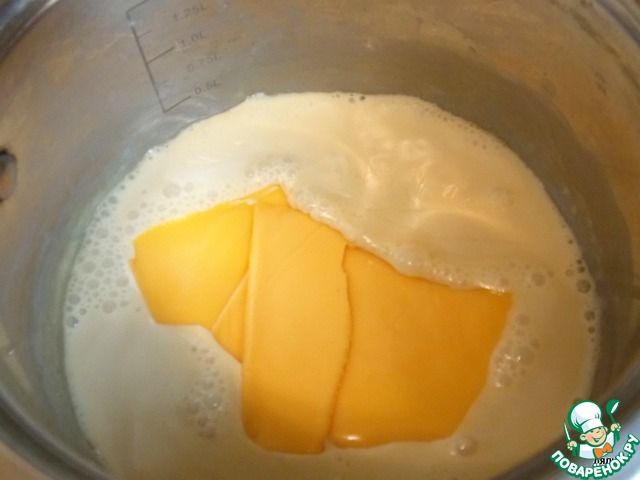 Пока перец маринуется и готовится, делаем соус. В сливки добавить соевый соус ТМ "Kikkoman", довести до кипения. Положить сливочный сыр, довести до однородной массы, постоянно мешая. Добавляем пластины плавленного сыра (типа "Чеддер") и греем мешая до однородной массы.