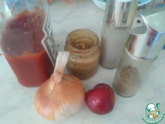 Мясо моем, удаляем лишнюю влагу. У меня два куска шейного отруба на кости, можно приготовить и другой тип мяса. Солим, посыпаем любимыми специями (я использовала черный перец и готовую приправу для свинины). Убираем в сторонку. Тем временем готовим соус: в чашке смешаем кетчуп или томатную пасту, горчицу (у меня домашняя, можно любую), и отжатую через чеснокодавилку сливу. Слива придаст легкую кислинку, одной сочной сливы будет достаточно, иначе будет много жидкости. Все перемешиваем
