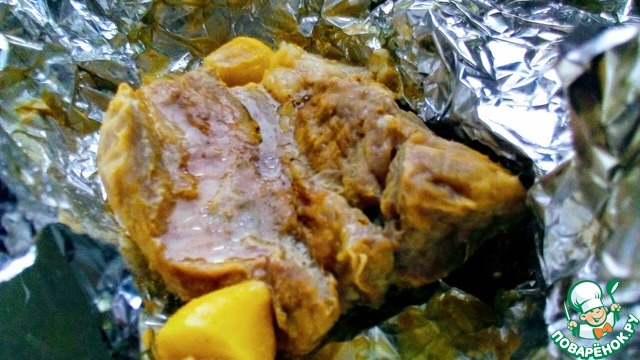 Мясо смазываем соусом с обеих сторон, кладём на лук и заворачиваем, оставляем помариноваться полчасика. Потом выкладываем мясо на дно мультиварки в один слой и включаем ее на режим Выпечка или Пирог, смотря у кого какая модель. И ждём, пока не завершится цикл приготовления, у меня это 1 час