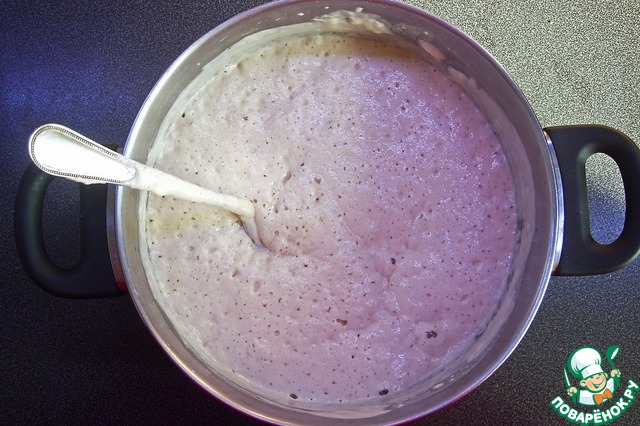 В тёплое молоко ввести муку и дрожжи, размешать. Поставить опару в тёплое место и дать ей подойти. На это уйдёт 40-50 минут.