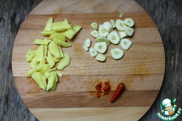 Для маринада чеснок и имбирь режим крупно. Нарезаем перчик.
