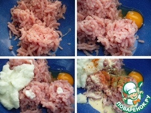 Приготовить фарш, мясо перекрутить на мясорубке, добавить яйцо, лук (я взбиваю в блендере), соль, перец, специи, манную крупу.