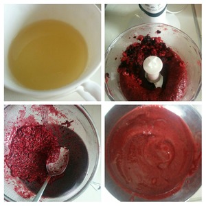 Желатин разводим в небольшом количестве воды. Ягоды перебираем в блендере в однородную массу. Если ягоды, как у меня, с косточками, протираем через сито. Добавляем желатин и смешиваем.