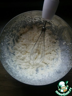Приготовим крем. Выливаем сметану в миску и взбиваем до пышности, постепенно добавляем сахарную пудру. Маскарпоне перемешиваем ложкой, небольшими порциями вводим взбитую сметану.