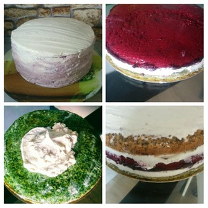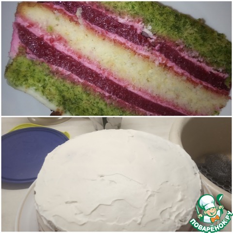 Шпинатный корж - крем - желе - крем - маковый корж - крем - желе - крем - шпинатный корж - крем.