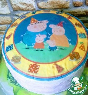 У меня форма 21 см. Из указанного количества ингредиентов получился торт более 9 см высотой. Я покрывала сверху вафельной картинкой.