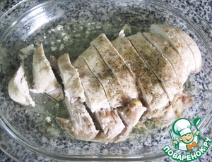 Разогреть духовку до 200 градусов. Куриную грудку помыть, обсушить салфетками. Посолить, поперчить, смазать оливковым маслом со всех сторон и запечь в духовке в течение 20 минут.