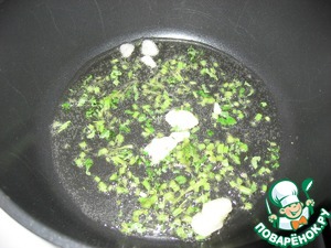 На дно кастрюли налить 1 ст. л. растительного масла и выложить мелко нарезанный базилик и чеснок.
