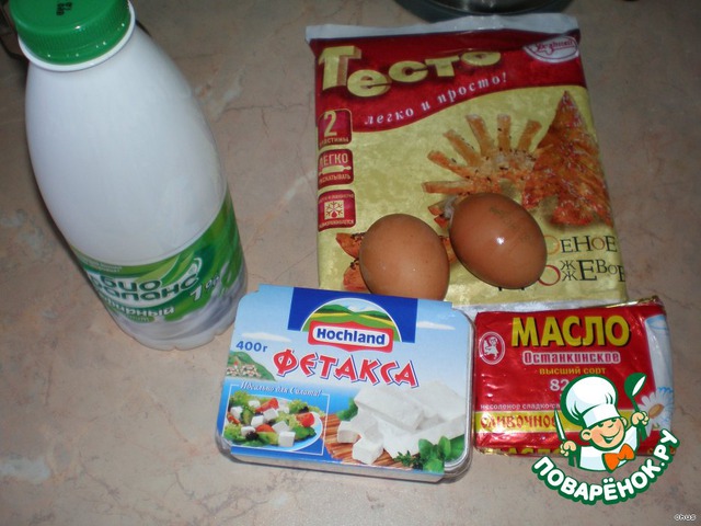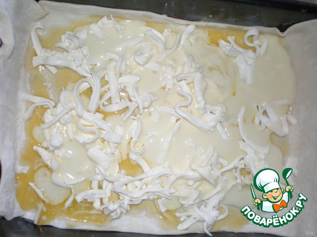 Выложить часть брынзы, полить кефирно-яичной смесью.
