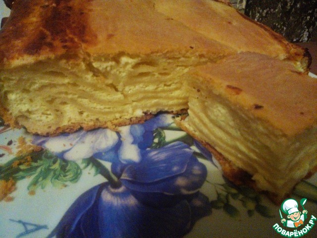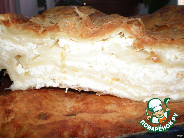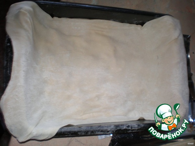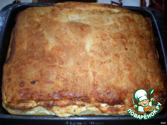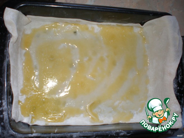 Выложить последний пласт, слепить края, полить оставшимся сливочным маслом, проткнуть в нескольких местах вилкой. Выпекать при температуре 180 градусов, 30-40 мин.