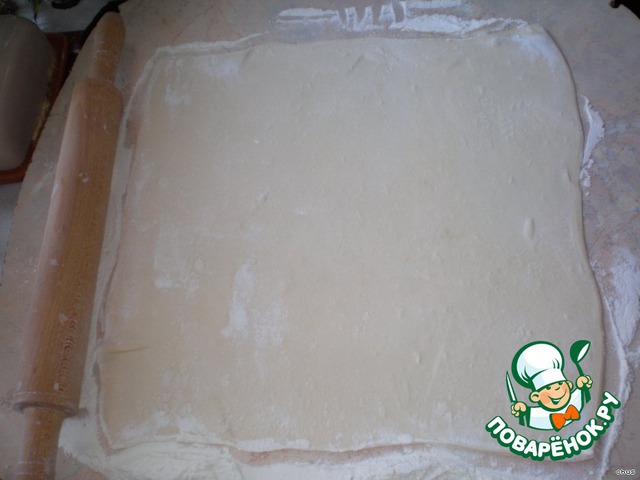 Kогда тесто растает, раскaтaть его до толщины 5 мм, каждый пласт теста разрезать пополам.