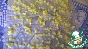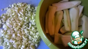 Очищаем от кожуры, мякоти и семечек. Нарезать кубиками - не мельчить, но и не слишком крупно. Посолить, накрыть полотенцем и оставить на часа 2-3, время от времени помешать. Если цуккини большие, то оставляем на часов 5-6, чтоб вышел сок.