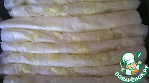 Наши кубики хорошо отжать двумя руками. Вбить яйцо, перемешать и можно заворачивать в листы теста фило. Как обычно - лист немного смазать подсолнечным маслом, распределить начинку равномерно, но не густо. И завернуть.