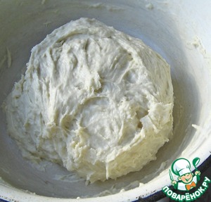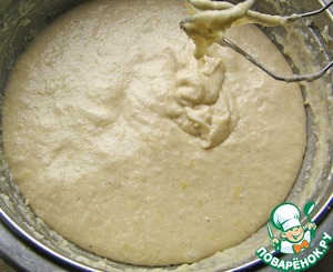 Смесь хорошо взбить. Мы должны получить совершенно гладкую, однородную массу. Постепенно добавляем просеянную муку с щепоткой соли, по два - три столовые ложки. Тесто должно быть однородным, без комочков.