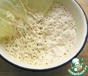 В зависимости от того, будете вы печь пирог на дрожжах или на закваске, смешайте ингредиенты для опары (одной из двух) и поставьте миску с опарой, накрыв пленкой, на всю ночь в холодильник – если печем на дрожжах. Если печем на закваске, оставить при комнатной температуре.