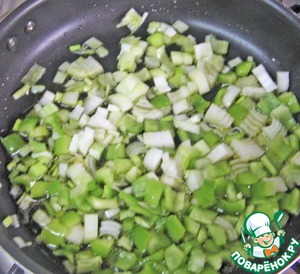 Зеленый перец и лук нарезать кубиком.